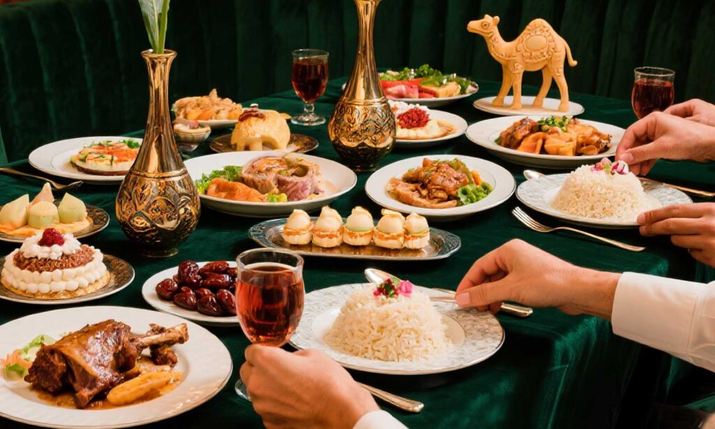Hotel bintang 5 menawarkan buffet premium dengan hidangan internasional, sering tema Timur Tengah atau Silk Road, ideal untuk bukber keluarga besar atau bisnis.